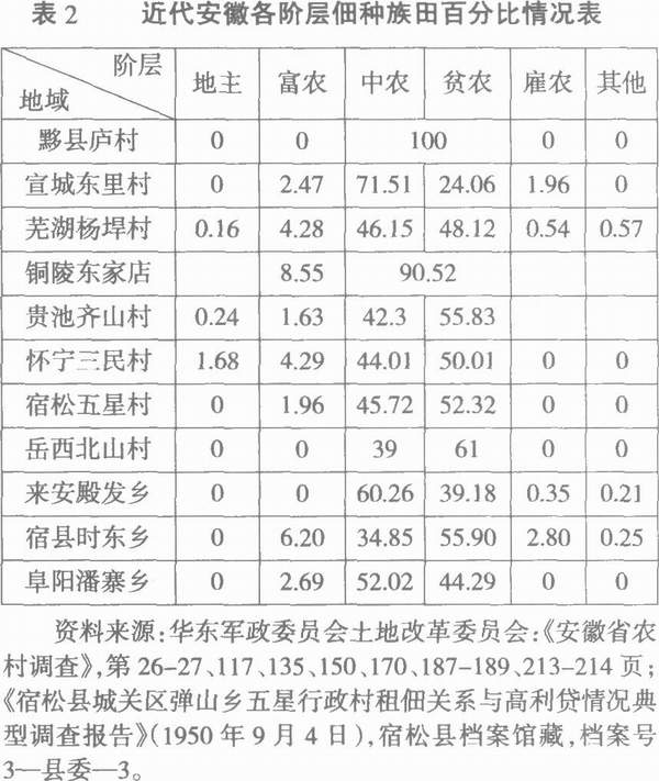 表中所列的是土改时期安徽自南向北作为典型调查的11个村(乡),虽不能精确反映全省状况,但能说明大概。在近代安徽,各阶层都有佃种族田的人,但差别很大。无论从各地还是全省总体看,中农和贫农租种了90%以上的族田。富农佃种族田在绝大部分地区都有,但所占比例很低,平均只租种了3%。地主、雇农和其他阶层不但极少租种族田,而且租田所占的比例也极低。