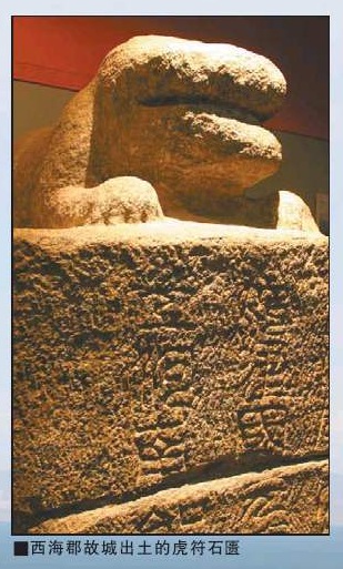 虎符石匮现陈列在青海省博物馆历史文物展室,记者来西海郡故城前已经前往参观过。虎符石匮分上下两部分,通高两米有余,上为石盖,雕有俯卧石虎;下为石匮,刻有“西海郡虎符石匮/始建国元年十月癸卯/工河南郭戒造”,3行22个篆字,仍清晰可辨。“始建国”为新莽年号。