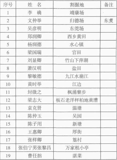 【22】此表根据《家记》第8页制作,按:表中所列乡豪的割据地皆在今东莞市、深圳市和香港特别行政区。参见《广东省东莞市地名志》,广东高等教育出版社,1987年;《深圳市地名志》,科学普及出版社,1987年。