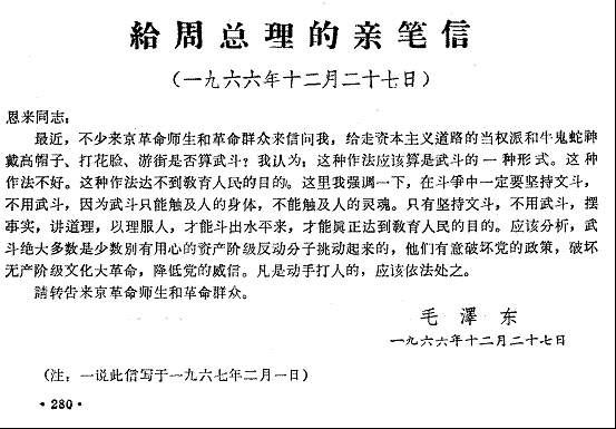 最近,不少来京革命师生和革命群众来信问我,给走资本主义道路的当权派和牛鬼蛇神戴高帽子、打花脸、游街是否算武斗?我认为:这种作法应该算是武斗的一种形式。这种作法不好。这种作法达不到教育人民的目的。这里我强调一下,在斗争中一定要坚持文斗,不用武斗,因为武斗只能触及人的身体,不能触及人的灵魂。只有坚持文斗,不用武斗,摆事实,讲道理,以理服人,才能斗出水平来,才能真正达到教育人民的目的。应该分析,武斗绝大多数是少数别有用心的资产阶级反动分子挑动起来的,他们有意破坏党的政策,破坏无产阶级文化大革命,降低党的威信。凡是动手打人的,应该依法处之。