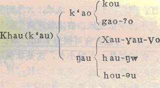 上面图解中的语音最古形式是Khau,次古形式为K‘ao,使用的地点是在广西西南角的龙州,镇都,云南东南角的广南,泰国北部和缅甸东北部的掸邦。这些地方连成一片,都处在深山密林中,与外界来往不便,具有保留古音的客观条件。