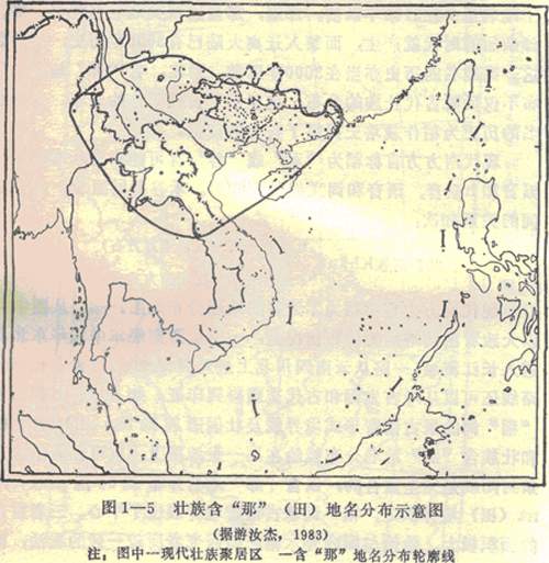 根据地名学的一般原理,地名在最初被命名时往往跟地理环境和历史条件有关。中国两广云南等她有许多含“那”的地名,因都是些小地名,不大受历史上改变隶属关系中对地名改变的影响,而得以保留至今。现代含“那”地名的分布地区在广西有1200多处,云南170多处,广东30多处,越南60多处,老挝30多处,缅甸3处,泰国2处。如把含“那”的地名分布绘成语言地图,犹如图1—5,图中每一小点代表l0个地名,不到l0个的也用一点表示。从图中可以看出含那地名的集中性和连成一片,其北界为云南宣威县的那乐冲(N26°),南界为老挝沙拉湾省的那鲁(N16°),东界为广东珠海县的那州(E113°5′),两界为缅甸掸邦的那龙(E97°5′)。这些地名90%以上集中在北纬21°~24°,并且大多处于河谷平原,就广西而言,70%以上地名集中在左、右江流域。这些地方的土壤、气候条件非常适合水稻种植。其次,部分地名的分布是在现代壮语聚居区之外,表明古代壮族人分布和迁徙的图像,也说明壮人在退缩到广西中、西部之前,早已从事水稻栽培。