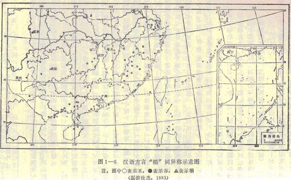 现代南方方言称稻为禾为谷的地理分布如图1—6。从图中可以大致看出栽培稻的传布情况是。一路从西南经华中和华东北上进入长江流域;一路从云南四川北上进入黄河流域。这两条传布的路线还可以从考古发掘和古代交通得到印证。如果把壮侗语族“稻”词的最古语音形式境界线及壮侗语族的na(田)境界线和壮族含“那”地名分布线绘在同一张地图上,就可以看出这三条封闭线是完全重合的,以含“那”地名分布线的范围最大,na(田)境界次之,“稻”词最古语音境界线位于中心。三者重合的面积极大,恰恰与国内外水稻起源研究者所较一致的看法,即广西西南,云南南部,越南北部,老挝北部,泰北部,缅甸掸邦是亚洲栽培稻起源地的观点相当一致,这是从历史语言地理的角度为这一观点添注了论证。