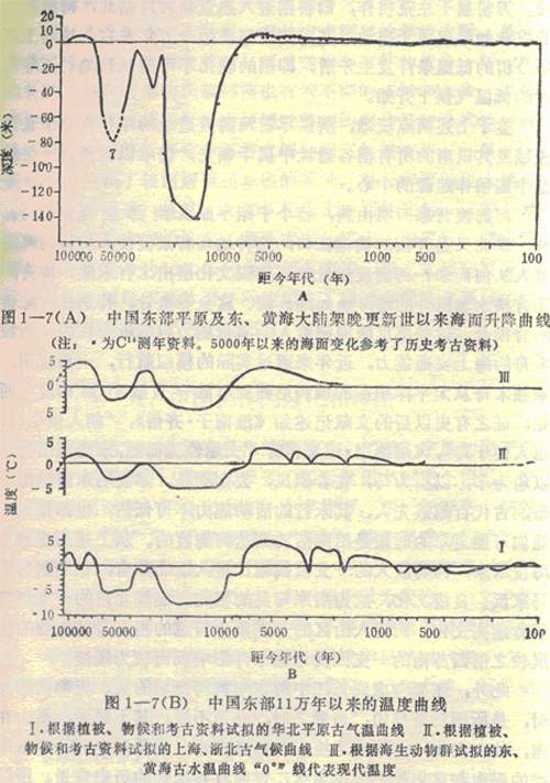 首先,从中国东部晚更新世以来的气候变化来看,据王靖泰等的研究[6],中国东部ll万年以来的温度变化,犹如图1—7所示,图中共有三条曲线,I线是根据植被,物候和考古资料试拟的华北平原古气温曲线;Ⅱ线是根据植被物候和考古资料试拟的上海,浙北古气温曲线;Ⅲ线是根据海生动物群试拟的东海、黄海古水温曲线。这三条曲线都呈现一致的气候波动趋势。从Ⅱ线的横座标年代上可以清楚看出,上海浙北地区是在距今约8000年时气温才开始上升,到距今约7000年时达到较现在的温度高2~3℃的气候,即相当于现今华南的气侯。这就是河姆渡原始农业赖以生长的基础。从图中追溯到距今9000~20000年的这一漫长时期,是这一带(华北也有同样趋势)温度最低的时期,其下降的幅度大于上升的幅度,约比现今温度平均低4~5℃。即令当时已经居住有较河姆渡人早1万多年的原始人,他们从事的采集和渔猎理所当然地是完全不同于河姆渡时期的植物资源和动物资源,更不可能有野生稻的生长或栽培稻的经营。