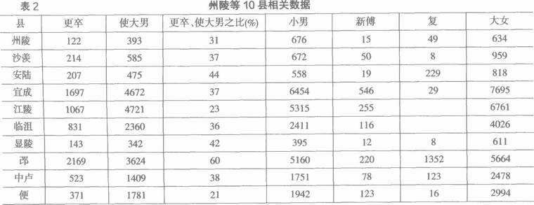 我们回头来看表2。在数据具备的十个县中,更卒均只占该县使大男的一部分。其中更卒与使大男之比最低的是便(编),为21%;其次是江陵,为23%;最高的是邓,为60%。此外7县在31%-44%之间,比率相差不大。