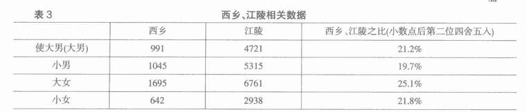 彭浩先生认为:牍文“使大男、大女”,是指年龄在十五岁及以上的男性和女性。“小男、小女”是指十四岁及以下男性和女性。结合《二年律令》的免老规定,可知牍文的“使大男、大女”是指年十五至免老年龄的身体健全的男、女性。【31】在秦汉简牍所见男性称谓中,我们已经熟知的有未使男、使男、小男、大男。其中6岁以下为“未使男”,7至14岁为“使男”,15岁以上称“大男”【32】。未使男、使男又统称“小男”。【33】其间不容再有作为另外一个年龄阶段的“使大男”存在。在松柏所出《二年西乡户口簿》统计的四项人口指标中,有大男、小男、大女、小女,其中“大男”正好对应53号木牍的“使大男”。与此同时,西乡作为江陵的一个乡,【34】其大男991人,约为53号木牍所记江陵使大男口数(4721人)的21.2%,与西乡小男、大女、小女与江陵同类户口之比相当(看表3),也是一个佐证。因而,彭浩先生此说应可凭信,“使大男”应该是“大男”的另外一种称谓。