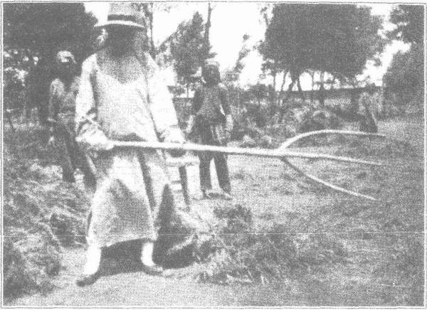 弯曲那个8英寸宽、3英寸厚的又长又重的船壳板则相对比较容易。船壳板被水浸透,一端被架在一个高出地面4英尺的支撑物上。人们在壳板下方挥动一捆燃烧着的稻草来烘干湿壳板。在自身重力作用下,烘千之后壳板将弯曲成所需的形状。弯曲或者拉直竹竿通常也是采用这种方式。图4—4所示的木制叉子也是用这种方式做成的,可以看出做叉子的树不是很大,有三根大树枝。现在这个叉子在我翻译的手上,翻译右边的女人用它来翻转小麦。