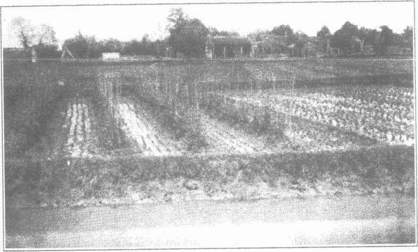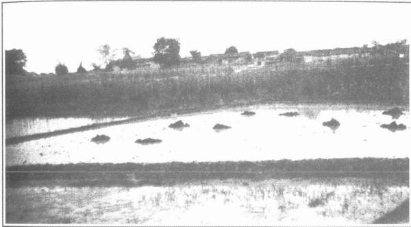 图4—7 在第二季水稻收割之后留下的茬干之间种植豌豆以及三条平行的运河