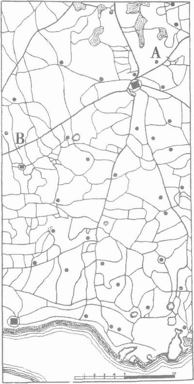 图5—1中显示了我们途经的718平方英里的区域上运河的分布情况.所有线条都代表运河,这些被标记出来的运河还不及总数的1/3。 A点位于嘉兴附近,是我们开始作记录的起点,8点接近图的左边缘,两点之间有43条运河从主航道上部的乡村中流出,其中8条有标记;主航道另一侧有近86条分支运河将河水引出三角洲平原汇人大海,而图上仅显示其中的12条。 另外,在乘铁路从上海到南京的旅行过程中。我们也记录了运河的数目。但这个数据仅仅是我们从火车上看到的。 在162英里的行程内,共有593条运河分布在龙潭和南翔两个区域之间。这是上海和杭州之间的一个区域,在此平均每英里我们就可以看到3条运河。
