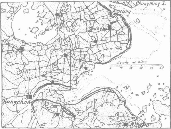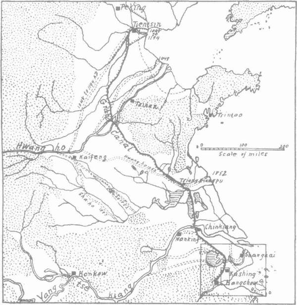 图5—3 中国东部和北部区域的冲击平原和大运河,从杭州到天津的大运河长达800英里,平原的海拔高度不超过100英尺.小矩形内部区域详细情况如图5—1所示