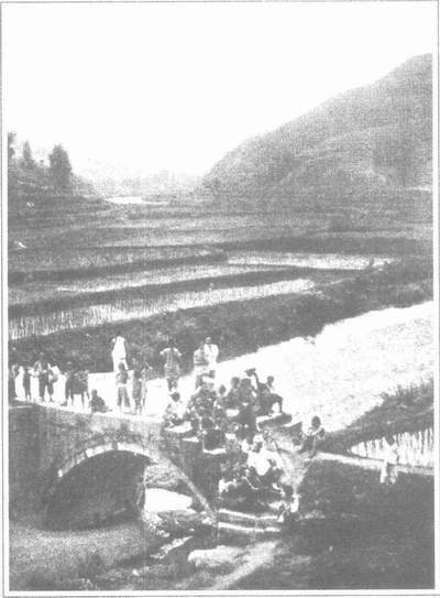 图5—3显示的是一个地势低洼的沿海广阔平原,在图的东南角上运河体系由两个矩形标识出来。 图中从南方的汉口一直延伸到北方的天津的粗黑线代表的就是这条总长超过800英里的大运河。 运河以东平原的沟渠化程度与图5—2所示区域的水平相当。 1852年时这个平原向北一直延伸到黃河人海口。 因此,在山东和河北之间众多河流的两岸,及运河和海岸之间,都存在面积广阔的平原区域。 沿着长江流域向西,沿岸的安徽、江西、湖南和湖北等省都有广阔的渠化地带,其面积很可能已突破28000平方英里。 图5—4、5—5展示的便是这些地区的景色。 再往西便是四川省的成都平原。 这块平原面积为30 X 70平方英里,当地的灌溉系统号称“中国最发达的灌溉系统”。