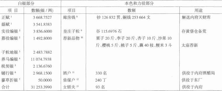 为便于直观了解,现将上述各项赋役收入整理为表1。其中正赋、繇赋、实役、募役、蓼草折银为万历二十年(1592年)数,子粒地银、养马编银为万历十八年审编数,契税银为万历十九年数,铺行银为万历十六年审编数(每五年一次审编,数内含通州解补银约400两),本色部分皆为历年沿用数。除契税银历年变化较大外,其他各项数字均较稳定。为求时间统一,本表通计为万历二十年数。此外,原书所列白银的数量,如以两为单位,有些数字细微到小数点后十几位(依次为钱、分、厘、毫、丝、忽、微、纤、沙、尘、埃、渺、漠、糢),本表保留到小数点后四位,不满毫者四舍五人。