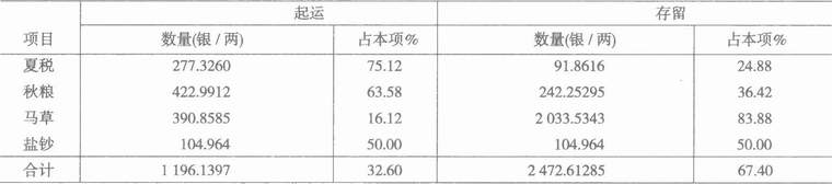 将田赋的一部分起运到京仓或边仓,是所有地方政府都要承担的义务,即便与中央政府同处一城的宛平县也不例外。宛平县正赋中包括的四个项目,都由中央政府事先划定了起运和存留的数额,而且各项的起存比例都不相同,其中夏税的起运比例最高,而马草的起运比例最低(见表2)。