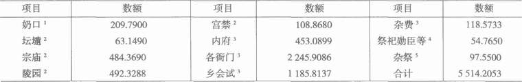 说明:按万历十六年谒陵支出数额计算。按万历十四年延庆公主婚礼支出数额计算。资料来源:1.《宛暑杂记》卷14,《经费上·宫禁》。2.同书卷15,《经费下·各衙门·礼部》。3.同书卷14《经费上·行幸》。4周书卷l4《经费上·宫禁》。5周书卷20《志遗五·宫禁传取》。6月书卷20《志遗五·藩王之国》。