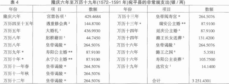 除表3所列年度性或周期性的常规支出外,朝廷遇有偶然性事务,也经常向宛平县摊派银两。笔者汇列散见于《宛署杂记》中的相关记载,制作成表4。需要说明几点:其一,据《明神宗实录》和《明史》,自万历八年到十六年(1580—1588年),皇帝曾6次到天寿山谒陵或阅寿宫,每次耗用钱粮不等,沈榜只记载了万历十六年一次的费用,其他几次姑且准此计算;其二,万历九年到十四年,共有4位公主结婚,沈榜记载了万历十四年延庆公主婚礼支出,并谓其他3位“婚礼相同”,所以4次婚礼支出均按此标准计算。顺天府题本曾谈到:“二县设附辇毂,每有卒然之费,如圣驾谒陵,则两县费约千余,大婚及选驸马等项,则两县费几四五百两。”【42】表中谒陵和公主婚礼的支出,均低于顺天府所言数额,看来实际费用可能还要多一些。其三,沈榜记载“遇重修《大明会典》”共用银144.87两,此项工作起动于万历四年,至十五年告成,历时11年,书中所记银数是历年总支出数还是每年支出数,不太明确,表4系按历年总支出数计算。总计从隆庆六年至万历十九年(1572—1591年)的20年间,宛平县的临时支出约3251.4301,每年平均162余两。除重修《大明会典》一项外,其他均用于皇室消费。