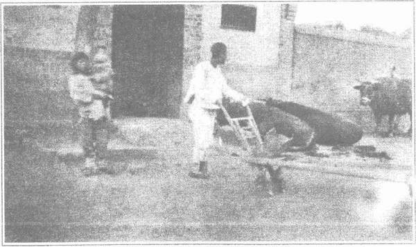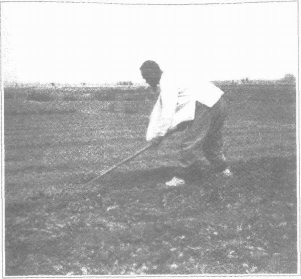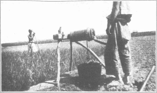 图2—4展示的是附近另一位农民正在一口井旁边,抽水灌溉30英尺宽、138英尺长的大麦地。 我们也和这个农民谈了一会,得知他所拥有的并且可耕作的土地只有1.67英亩,但他家里却有10口人,拥有的1只毛驴和1头猪。 照此比例,40英亩的土地可养活240口人、24只毛驴和24头猪。 而平均每平方英里的土地可养活3840口人,384只毛驴和3684头猪。 风调雨顺的时候,他的收入能达到73元(金币)。