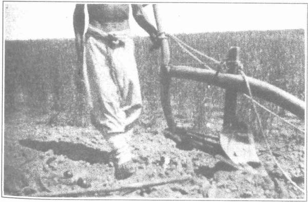 老农的犁头是铁制的,呈V字型,犁板是块弯曲的铸钢,用它翻动土壤的效果非常好。 标杆是木制的,在其末端有一个用于测量垄沟深度的大铁块。 这个犁的售价是2.15元(金币)。 在结束了一天的劳作之后,农民就会扛着它回到远在一英里外的精心装饰的家中。 据中国历史记载,犁是由神农发明的(公元前2737—前2697年)。 神农一生都在教授农业技术以及草药的使用方法,因而被后人尊称为“农业和医学之父”。