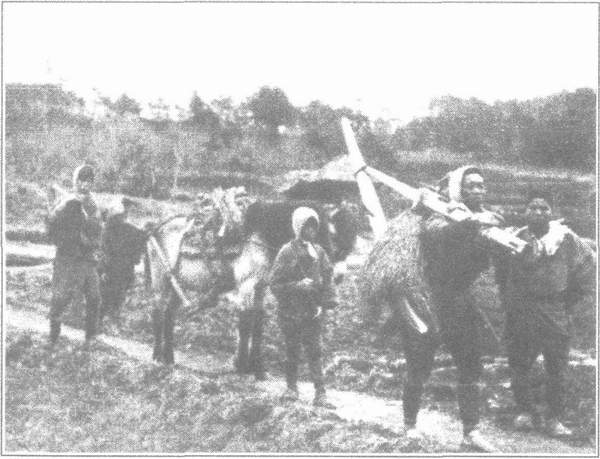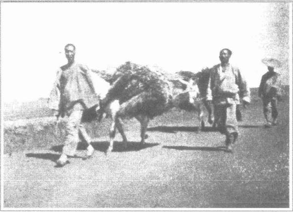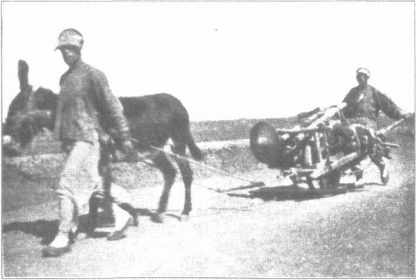 在青岛附近我们看见了图2—9所示的,从胶州而来、经过许多村庄的独轮货车。 这些独轮推车上装载的都是日本制造的火柴,现在离开胶州已经有11英里了。 我们在上海和其他一些城市看见的独轮车车夫中大多数都来自山东,他们背井离乡来这儿务工,心里都盼望着能旱日回家。 在秋季,很多人也会西行或北行至满洲务工,到冬季的时侯再回家。