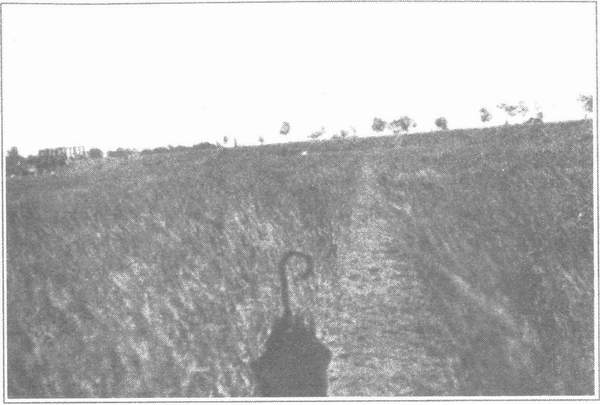 图10—10所示的是旱季时山东即将成熟的一些小麦,图中田里伞的高度相当于小麦的高度,大约3英尺多一点。 小麦地的右边有几座坟墓,看上去似乎与天空连成了一片,因而天空也呈锯齿状。 放眼望去,我们没看到一座山,因为所处的是广阔的大海冲击平原,平原正好处于两座构成山东高地的山岛之间。