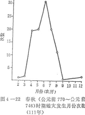 1.蝗虫。古籍与蝗有关的称呼有蝝、蝻、螽三字。蝗在《左传》称螽,《公羊传》称蝝。始见于《春秋》鲁桓公五年(公元前707)。蝝为螽的若虫,后世称蝻。始见于《春秋》鲁宣公十五年(公元前594):“初税亩,冬,蝝生。”《史记·秦始皇本纪》:“始皇四年(公元前243),蝗从东方来,蔽天。”这是飞蝗大迁徙的最早纪录,也是称蝗不称螽的开始。故《说文》释蝗说:“蝗,螽也。”口语又有称蝗为蚱蜢的,《月令章句》云:“蝗,螽类。江东谓之蚱蜢。”专门统计历史上蝗灾次数的是徐光启的《除蝗疏》,指出春秋294年中(公元前770~前476)有蝝灾的次数共有lll年,他是按蝗灾发生的月份统计的,结果可以明显看出蝗灾“最盛于夏秋之间,与百谷长养成熟之时正相值也”(《农政全书》卷四十四荒政)(图4—22)。徐光启的统计与本世纪20年代江苏省昆虫局及浙江省昆虫局研究全国各地蝗虫的发生季节非常吻合。就飞蝗而言,各地以5~8月为蝗患的最重要时期。夏蝗以5月中至7月上旬为最盛,秋蝗以8月上中旬为最盛。 6、7两个月为夏秋蝗并发时期。这与图4—22中的近于常态分布的曲线非常一致。