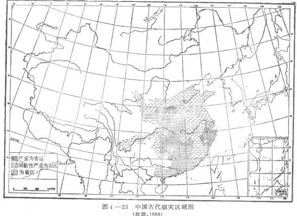 据螟虫为害程度的轻重,沈璐将其分为四个区域:1)分布区;2)为害区;3)间歇性严重为害区;4)严重为害区(图4—23)。