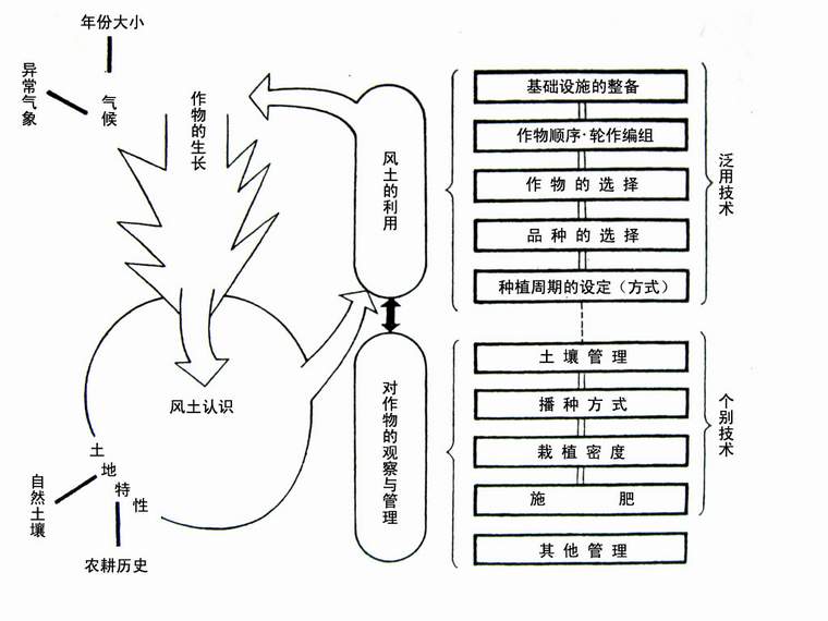 风土技术是被动的,类似一种容器装置,是在地区文化和长期的历史中形成的经验发挥主要作用。这种风土技术中,有饭沼二郎所说的宏观的内容(比如季风地带),也包括三泽胜卫所论述的微气象·微地形等微观的内容。农民对于宏观的风土几乎都是被动接受和适应的。而微观的风土在某种程度上是可以改变的,也经常以村庄和地区为单位进行。在对风土技术进行论证时,很容易产生类型化的风土论。