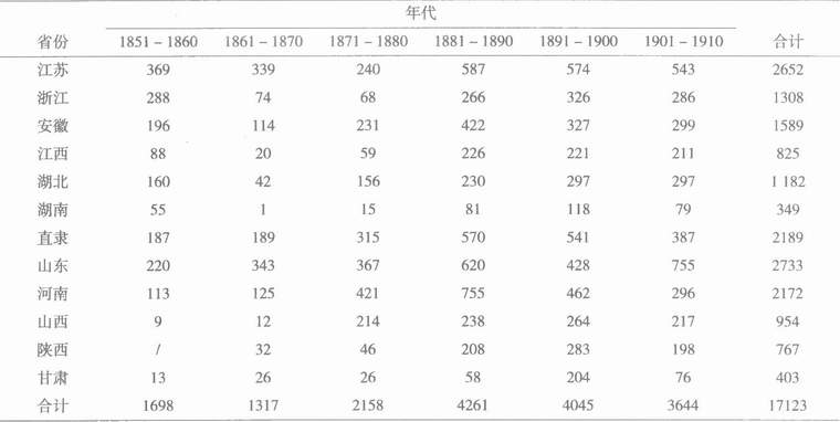 由表1清晰可见灾荒的“积累性”。灾害频发,令人震惊。而这还仅仅是12省不完全的统计。另据日本学者佐藤武敏著《中国灾害史年表》对1840年到1911年灾荒频度的统计,在72年里,全国共发生各种自然灾害1354起,平均每年18.8次,每月都有不止一次灾荒发生,这个“远不完全的统计”,从“总体上基本显示了灾荒在近代社会中的持续性和多发性的态势。”[4]①