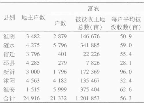 据表1,7县地主的总户数相当于富农总户数的116.8%。真正地处淮河以北的淮阴、涟水、宿迁、邳县、新沂、沭阳6县中,竟有5县(仅涟水除外)地主户数多于富农户数,6县地主总户数相当于富农总户数的150.7%。