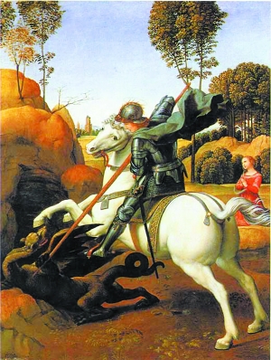 西方龙(Dragon)与中国龙的内涵和象征意义完全不同,西方龙是毒龙,是丑与恶的化身。图为欧洲文艺复兴时期意大利画家拉斐尔根据欧洲的一个著名传说——“圣乔治屠龙”而创作的画作:《圣乔治与龙》。