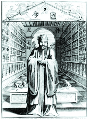 在欧洲历史上,中国龙曾被视为神圣地位的标志。图为1687年欧洲出版的《中国哲学家孔夫子》一书中所载的孔子画像,此画上方配了一幅中国传统的“双龙戏珠”图案。