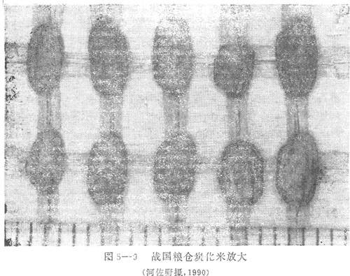 1975年考古发掘在江西新干县界埠袁家村,近赣江边,发现两座战国粮仓的遗址。仓呈长方形,长61.5米,宽11米。坐东朝西。从大量瓦片和柱洞判断,这是一座土木结构的仓房,屋顶铺瓦,仓内地面开四条平行的纵沟,宽深约0.5米,长61米,沟距1.4米。纵沟之间又有小横沟,宽深0.2米,长1.4米,横沟沟距l米左右。这样的纵横开沟,显然是为了地下的空气流通,防止米谷受潮。仓内堆积的炭化米,厚度自0.3~1.2米,其中一部分米粒完整(图5—9)。据鉴定,属粳稻[1]。新干县位于北纬约27°6′,在地理上属籼稻分布的地区,但出土的米粒用肉眼看也是粳米,经测定其长宽比,为1.76±0.24,也属粳稻。这一现象,很值得研究。
