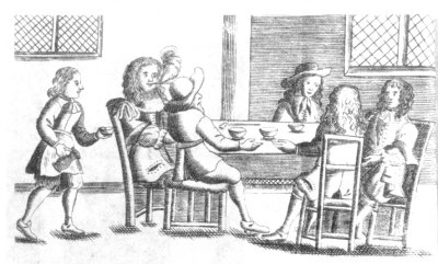 这是迄今所知有关英国咖啡馆最早的绘画。这幅1674年的木刻画来自保罗·格林伍德的一张“让人清醒并有益健康的咖啡饮品的优点”的广告单页。