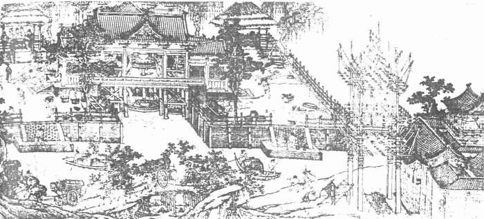 船碓的设置如何,又是怎样工作的?明宋应星《天工开物·粹精第四》云:“江南信郡水碓之法巧绝。盖水碓所愁者,埋臼之地卑则洪潦爲患,高则承流不及。信郡造法即以一舟为地,橛樁维之。筑土舟中,陷臼于其上,中流微堰石梁,而碓已造成,不烦椓木壅坡之力也。”明人林时益《下桥》诗有“下船舂米先冬办”句,自注:“船上设轮与臼,以堤堰水,置船急流处,冲轮杵米。”[22]可见,船上要安置水轮、石臼,同时要筑堤堰水,造成急流,把船停泊或固定(“以一舟为地,橛樁维之”)在堰旁,利用急流冲击水轮工作。上引材料谈到的宋代船碓,有一部分可能是这样工作的。陆游《栈路书事》:“危阁闻铃驮,湍流见硙船。”[23]这里的“硙船”也可能属于这种类型。这些船碓应是专门或主要舂碓的。