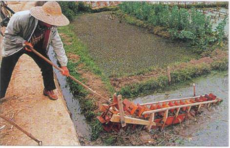 手摇翻车:三国马钧制作了手摇翻车,明代宋应星《天工开物》卷上《乃粒》载有小型的手摇翻车——拔车,并附有图像。近世各种形式的手摇翻车一直在使用。谭嗣同主张引进西方的水利机械,认为“可省筒车之费与手车、脚车之劳”[1]。这里的“手车”就是指手摇翻车。但是从三国至宋元,手摇翻车似乎销声匿迹,这是为什么?看来,它是隐藏在“翻车”或“水车”的笼统称呼之中了。例如,唐代文献中没有手摇翻车的记载,但日本的文献却明确无误地表明唐代手摇翻车的存在。宋元的情况也应该是如此。它在现实生活中,不可能突然中断和消失的。就名称来说,也不是绝无线索可寻。例如元代任仁发在《水利集》中谈到浙西的水利工具和设施时,提到了一种叫“手戽”的工具。[2]据本丛谈上辑的研究,“戽”也可以作为翻车的别称。如是,则“手戽”就可能是手摇翻车了。[3]