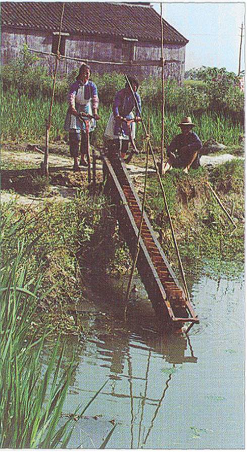 现在再回过头来再与筒车作些比较。筒车形制较大,又要安置在公共的河流之中,单独的个体农户难以为力,一般或由富户、或由寺院、或由村庄农户合力置办。翻车一般不能利用水流激动以省力提效[8],在这方面,即使“江吴”的“七蹋”也比不上筒车;但它形制多样,制作相对简便,可以提供不同条件的农户选择使用,具有更广泛的适应性。例如小型脚踏翻车,制作方便,一般农家能够置办;大型脚踏翻车适宜于地主田庄或较大的工场。小型手摇翻车则更适合贫苦少地和缺乏劳力的农户使用。多车递接或联动或为个体农户互助,或为地主农庄所用。牛转翻车结构比较复杂,造价较高,估计富裕户或大工程才能用得起或用得上。社会需要是多种多样的,翻车的多样性更能满足不同的需求。这种广泛的适应性使得它具有强大的生命力。