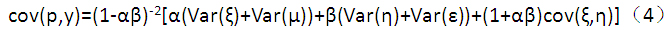 其中,η代表产出所受当期价格之外的影响,来自如气候、技术等因素。ξ代表价格所受当期产出之外的影响,来自如货币、进出口等因素。ε及μ为其他独立的随机扰动。很显然,η和ξ会有一些共同因素,如人口、预期价格等等,所以,它们不可能是独立的,必然有一定的相关性。当产出和价格如(3)式所定义时,会如何影响GDP估算呢?回到(1)式,也即产出和价格的协方差此时会如何呢?由(3)式可得: