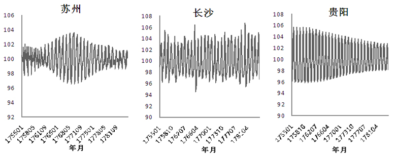 图1绘示了1755~1785年间,苏州、长沙、贵阳三府中米价格以百分比表示的季节波动。之所以选择这三府,是因为它们代表了不同类型的地区,我们的结论因此不至于以偏概全。从图中首先可以发现,季节波动的确不是一种机械的运动,以往文献用常数的方式来刻画并不妥当。以苏州为例,季节性在1770年前后较强,而两端较弱。但贵州则不然,对于所选时期,季节性是逐步减弱的。这表明,对于不同时期、不同地区,季节性的影响可能都不相同,难以一概而论。不过,尽管在季节性的强弱上各地有别,苏州稍弱,长沙、贵州依次略强,但令人欣慰的是,整体上,季节性的影响都有限,最贱月比均价所低大体不出4%之谱。即便由此带来的增加值高估比例可能更大一些,可比起其他误差来,应该还是较弱的。