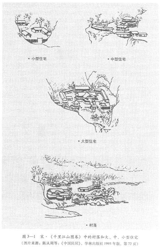 除了茅草房和砖瓦房以外,黄河上游的西北地区还有一种“土洞”居室。宋人记载说,当时的“麟州府在黄河西,古云中之地,乃蕃汉杂居。黄茅土山,高下相属,极目四顾,无十步平坦,庙宇覆之以瓦,民居用土,止若棚焉,驾险就平,重复不定,上引瓦为沟,虽大澍亦不浸润,其梁柱榱题,颇甚华丽,在下者方能细窥。城邑之外,穹庐窟室而已”。[35]背山坡而建,前面开一片平地当院子,不垒围墙,院子的边缘就是沟壑。在西北的黄土高原上,无论贫富都用这种土洞(类似今天的窑洞),富裕人家可以把这种土洞搞得很华丽,也不愿盖砖瓦房,显然这是当地传统的生活习俗。