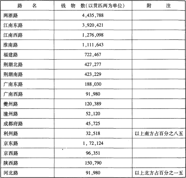 根据这两个表,我们可知除金一项,北方略较南方为多外,其余如钱、银、布帛等物,南方的上供额都远较北方为多。这许多由南方上供的物资,都要经过运河才能运到汴京政府那里去。可见运河实是当日中央政权的生命线。