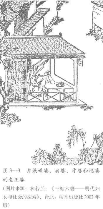 除了一般的服务业,当时日常生活的中介服务也是一些人获得收入的一个重要来源,比如,在各种买卖契约中充当中人,收取一定的中介费[5]。又如,媒妁之言乃婚姻当时成立的必需条件,所以,职业的和半职业的媒婆群体在明清时期也颇为活跃,作为三姑六婆[6]中的一员,媒婆尽管在当时的小说等文献中,多以负面的形象出现,但从中不难看出,她们借此获取的利益并不少。比如,《金瓶梅》中,在西门庆死后,春梅和潘金莲因为与陈敬济的奸情被月娘发觉,先后被逐出家门,让原来做中的薛嫂和王婆分别领去嫁卖。结果,她们两人分别从中赚取了三十七两五钱和八十两的差价。[7]关于春梅的嫁卖,书中描写道: