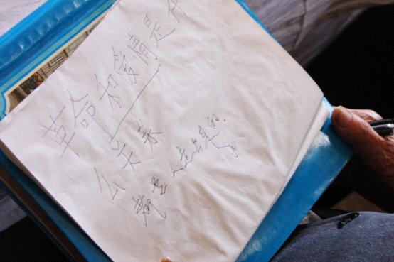 马老累了,看着我们递过的一张张字条,他看着看着便睡着了。听朋友说,两年前他还给青年讲述很多事情、痛批怒骂贪官污吏等不正之事。马老累了,他不止一次嘀咕“说完这个就散会了啊!”。讲着唱着,沉沉地咳嗽又努力地讲着,不时用纸巾擦嘴角眼角,与其他老人不同,他干净清爽。“要饭的苦孩子!”,大家不知他在说什么,原来他醒来指着书柜上放着自己相片的相框呢。马老的风趣惹来同学们的一阵阵笑声。听赵姐说有人提建议马老写回忆录,他不愿写,国家出钱要帮装修房子,他不许,说这是国家的房子等他走了要原封不动地还给国家。同学们问共产主义能否实现时,马老给了两句话“看你们了” “你们比我们那时好多了”;回答“您怎么看到生死问题”时,他说“我很重视。死有重于泰山,又很轻于鸿毛”;回答怎样看待爱情与革命的关系时,他说“都是人走出来的”。