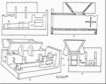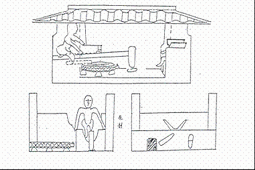 河南洛阳东关东汉墓出土的踏碓、风扇车模型,陶制,由高槛、车厢等组成,上部有进粮的长方形高槛,槛下有斜腿支撑,风箱左端两臂有圆形曲轴孔,正面中间下部有长方形出粮口,风箱后部还有糠秕的出口。出土时木制风叶已不存在,图6分别是其复原图和结构剖面图。【15】