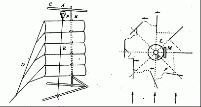 ”即齿轮的齿。另加的两扇“篷”起着导风于风轮的作用,扩大了风能利用面积。“不必如舟帆之随时转侧也”,则是对立轴式风车设计最为巧妙、最富科学性的风帆自动方向调节系统的记述。立轴式风车的风帆的张挂方式及风向自动调节原理如图15所示。风帆采用中国式硬质平衡纵帆,充分发展了其可较好地使用侧向风的特点,将风帆偏置风轮的棱柱上,靠外的一部分较窄,靠里的一部分较宽,各帆的正中上各由一绳E系之,此绳过滑轮P下行系于下部横杆上,起调节风帆高度的作用。各帆内侧由绳D拉着,D的长度以当帆面与风向垂直时恰能拉紧为宜。风轮转动中,每当帆转到顺风一边,它就自动趋于与风向垂直,所受风力最大;当帆转到逆风一边时,就自动转向与风向平行,所受阻力最小。这一原理使得风车不受风向变化的影响,也不改变旋转方向。