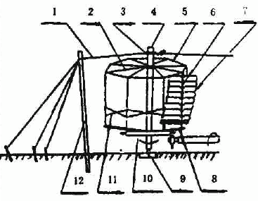 1.扬绳(4根粗铁丝或木杆,拉在大柱上),2.辐杆(伞盘秤),3.铁环(将军帽),4.立轴(大将军,直径大于8寸,高22尺),5.旋风榄,6.桅杆(小桅子),7.风帆(风篷,8个),8.座杆,9.针子(锥形铁轴端),10.平齿轮(车盘,车圈,直径10尺,88个齿),11.篷子股(支杆),12.大柱。