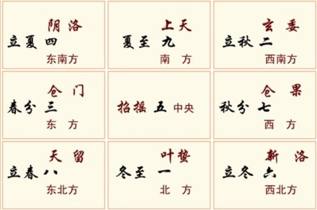 《黄帝内经-灵枢-九宫八风》记载了太一(即太乙,北辰之神)一年中游九宫的学说,与八节相配,上面说:“太一常以冬至之日,居叶蛰之宫四十六日,明日居天留四十六日,明日居仓门四十六日,明日居仓门四十六日,明日居阴洛四十五日,明日居天宫四十六日,明日居玄委四十六日,明日居仓果四十六日,明日居新洛四十五日,明日复居叶蛰之宫。曰冬至矣。”,其图示如图三: