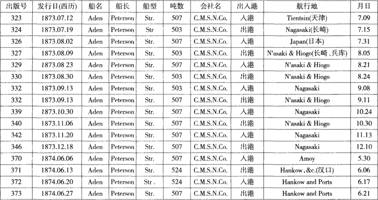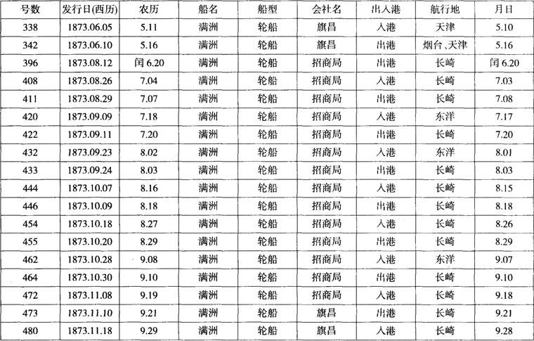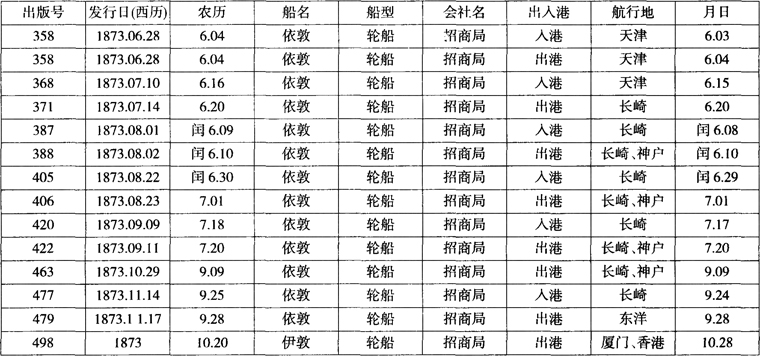 笔者根据1873年358—498号《申报》所登载的轮船出港、人港记录做成表1-1,可以说明伊敦号在上海和日本间具体的航行时间。