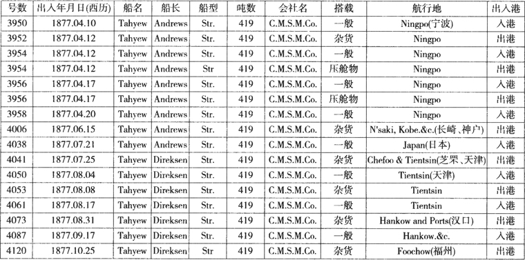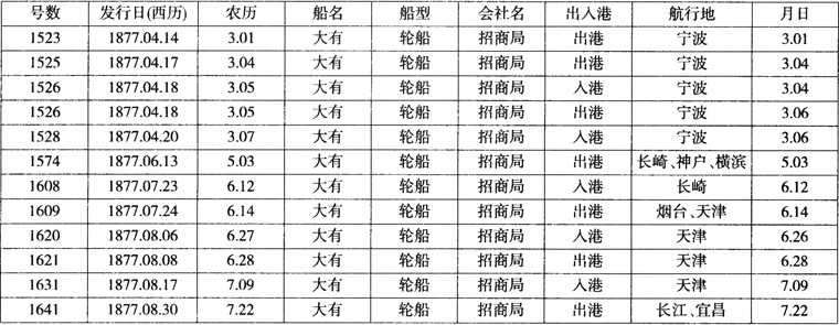 可见,大有号从上海驶往日本的出发时间是1877年6月15日,农历五月初三,经由长崎、神户和横滨,7月23日也就是农历六月十二日再回到上海,总共用了38天。大有号的日本航行只有这一次,在此之前,该船主要是承担上海驶往宁波的航行。完成长崎航行后,大有号承担天津和山东烟台的航行,之后主要航行于长江航线和福建福州。