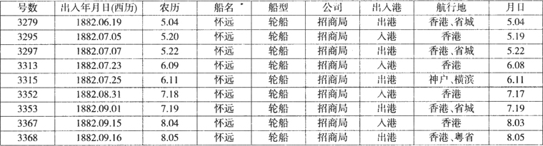 有关“怀远号”的日本航行,在《申报》(3315号)即1882年7月25日上也有记载,在该报的汽船出入表中,该船于7月25日由上海出发。驶往13本的神户和横滨。但却找不到有关该船由日本回航的记录。1882年8月31日的《申报》(第3352号)显示该船8月30日由香港回到上海。由此可知,怀远号驶往日本的神户和横滨,在这两个港口寄港后不是直接回到上海,而是由日本驶往香港。
