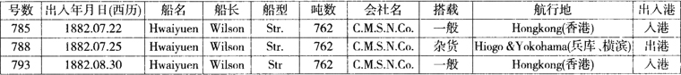 根据”Thc Noah—China Herald And Supreme Coua&Consular Gazette”做成的表4—1,1882年7月25日有轮船由上海驶往神户和横滨。在第788号(1882年7月28日)中的7月25日C.M.S.N.Co。 China Merchant.s Steam Navigation Co.中,轮船招商局汽船”Hwaiyuen”(762吨)大概就是怀远号,因为此英文注音与汉语发音”Huaiyuan”非常接近,而且航行日期也是一致的。通过表4—2可以看出,怀远号(Hwaiyuen)于1882年7月25日由上海出发。经由神户和横滨驶往香港,然后再返回上海,实现了一次驶往日本的临时航行。