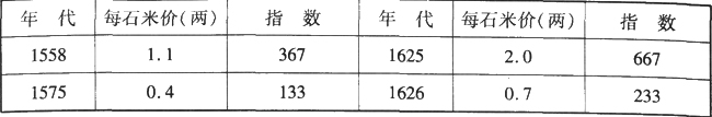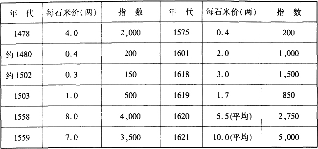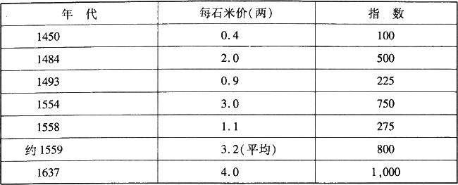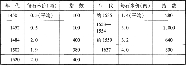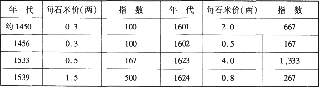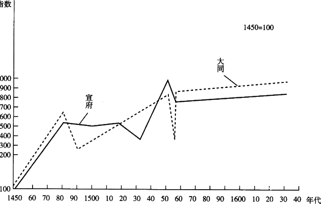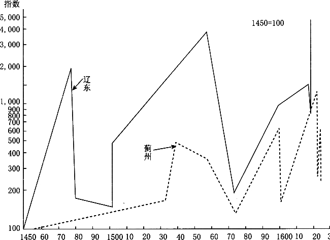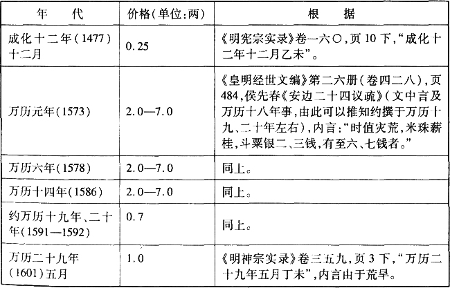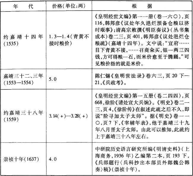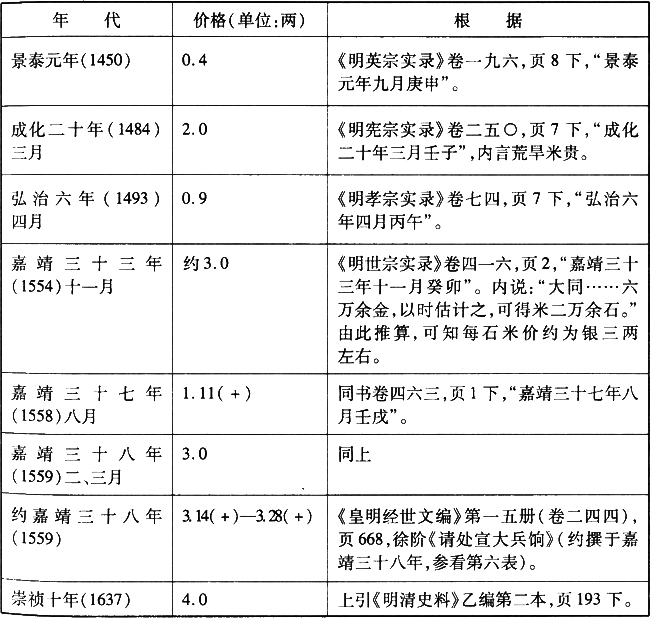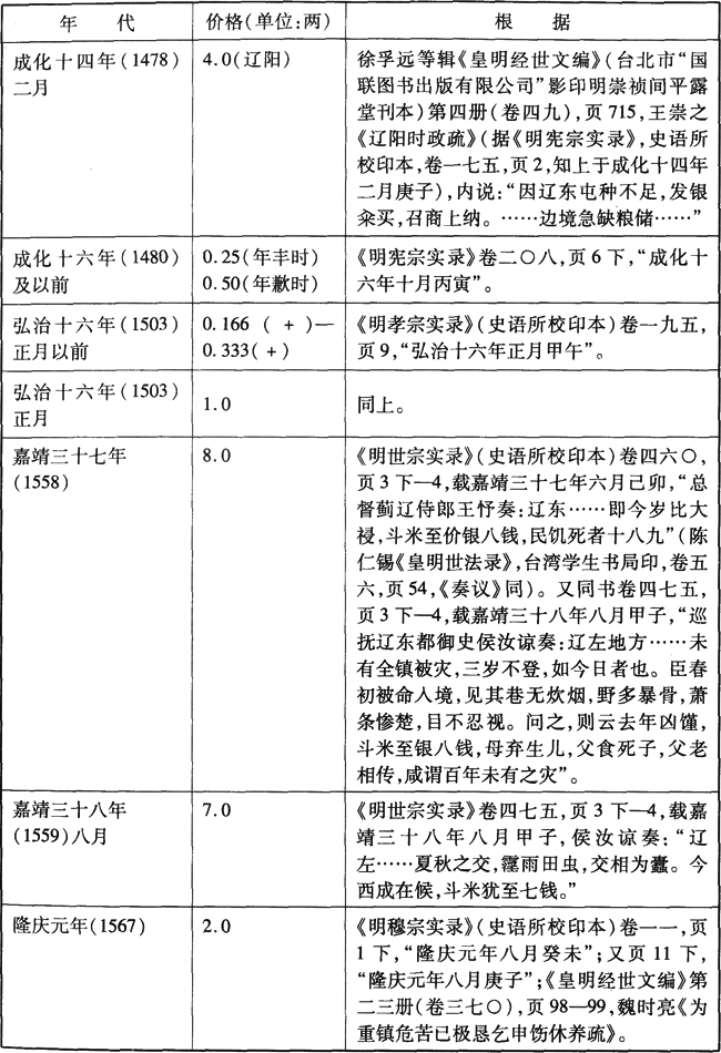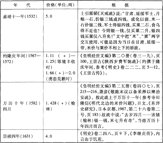 就辽东来说,在正统五年(1440)及以前,每石米只售银一钱至一钱余,比每石折征二钱五分的金花银还要低廉,可是在成化十四年(1478)却每石售银四两,嘉靖三十七、八年(1558–1559)售银七八两,及天启元年(1621)更高涨至每石售银十二两。如果拿前后三个米价上涨的高峰来比较一下,我们可以看见,第二个高峰(嘉靖三十七年)为第一个高峰的两倍高,第三个高峰(天启元年)为第一个高峰的三倍高。宣府、大同的米价,在长期间内虽然没有像辽东波动得那么厉害,但在嘉靖三十八年及崇祯十年(1637),米价昂贵至约为15世纪中叶的数倍或将近十倍。延绥的米价,在成化年间(1465—1487)以前每石不过售银二钱,但到了崇祯四年(1631)却上涨至每石售银四两,即约为15世纪中叶的二十倍。明代北边每五十年平均的米价,根据日本学者寺田隆信的研究,自1440—1489年,每石平均售银。.四八九两;1490–1539年,上涨至一.七五二两;1540—1589年,上涨至二.六五八两;1590–1625年,更上涨至四.四七七两。[8]由此可见,明帝国北方边境的米价,在15世纪中叶以后将近二百年的期间内,约上涨九倍多点。